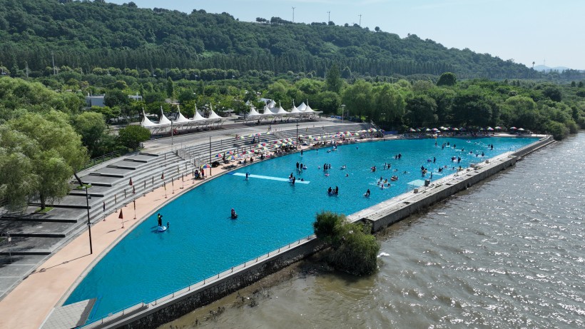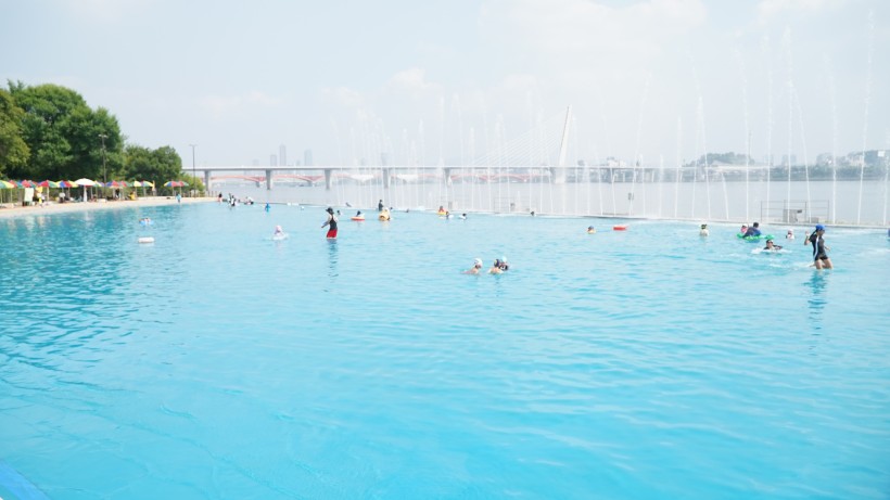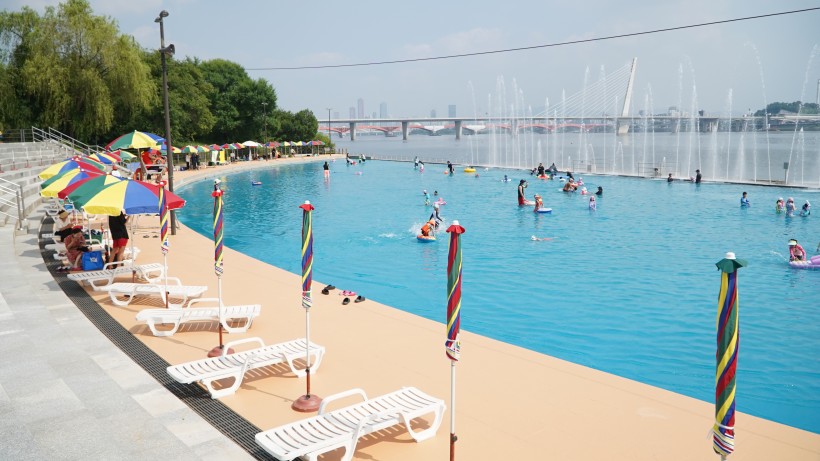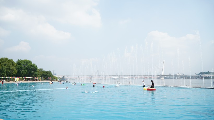 한강뷰 인피니티풀 형태로 조성되어 있으며, 최대 수심이 0.8m로 얕아서 어린 아이들과 함께하는 가족들에게 안전합니다. 다른 수영장과 달리 수영복 없이도 간편한 복장으로 이용할 수 있어서 부담 없이 물놀이를 즐기실 수 있어요.